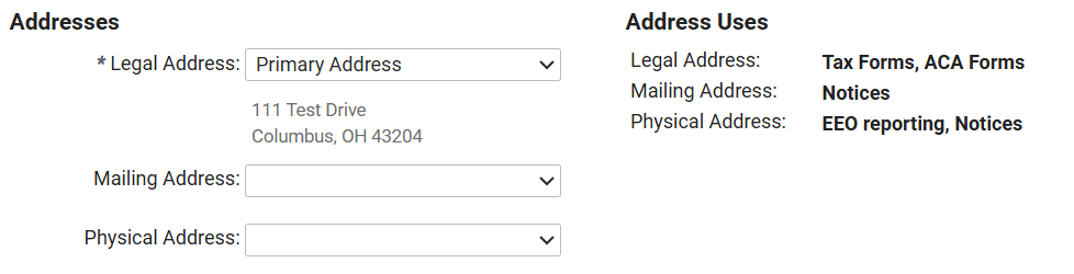 Address- Typically, Primary. If different utilize drop down to create new address if required.