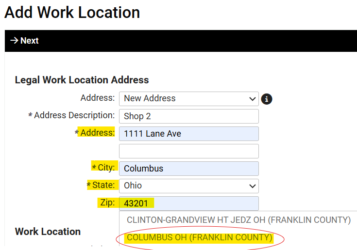 To Add Additional Work Location. You must first put the address thru the tax finder. This includes the work location that gets added during the building of the shell based off of the addresses we enter. The Finder | Department of Taxation (ohio.gov)