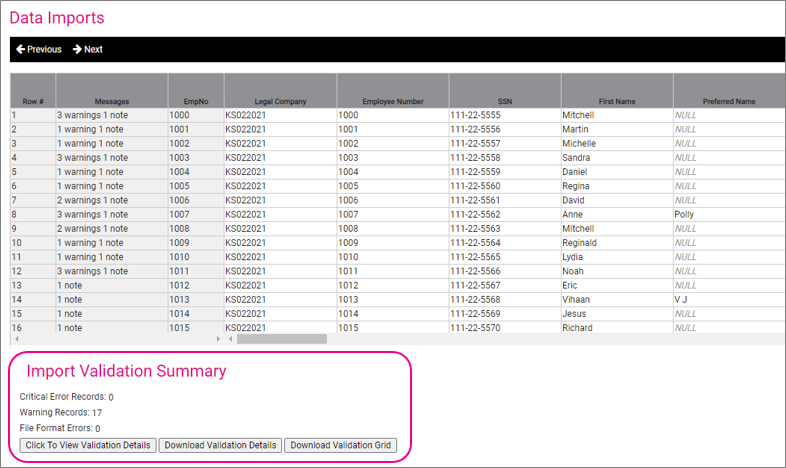 Confirm each employee’s information (name, hire date, SSN, pay rate, department, and location) matches the import file.